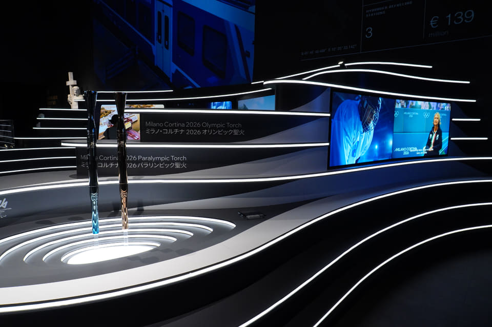 また、2026年に開催されるミラノ・コルティナ冬季オリンピック・パラリンピックの聖火リレー用トーチもこの万博で実物がお披露目され、人気の展示となった。