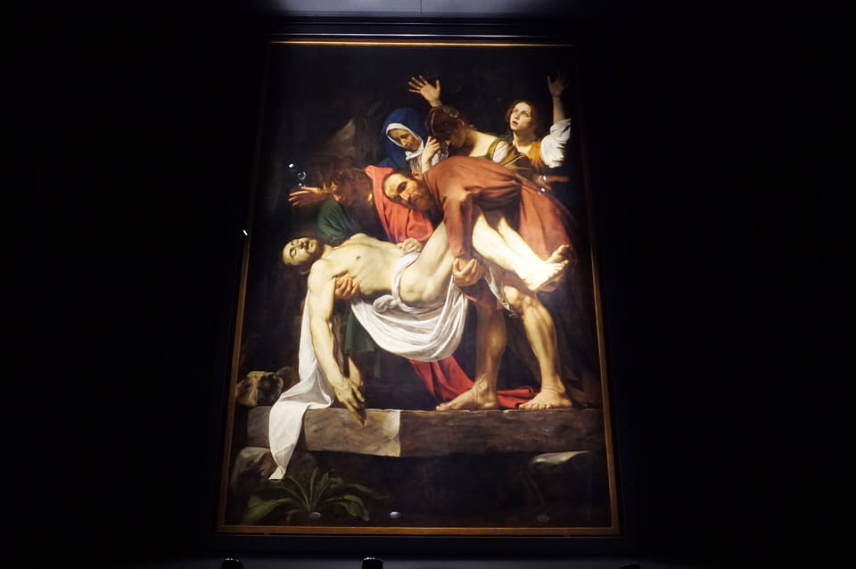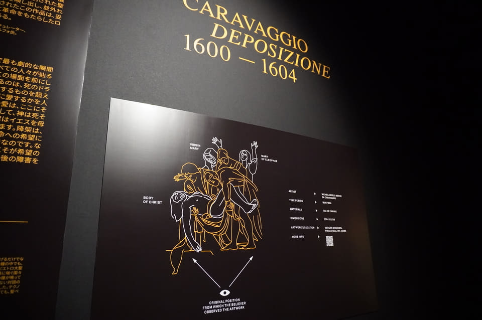 その奥、併設するバチカン館の「精神性」のエリアでは、イエス・キリストの遺体が墓に安置される瞬間を描いた、カラヴァッジョの《キリストの埋葬》(1604年)を展示。バチカン美術館所蔵の作品を特別に持ち込み、床からわずか30cmの高さに設置したことで、祭壇画として描かれた構図をほぼ同じ目線で体感できるのが貴重。