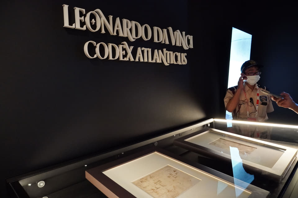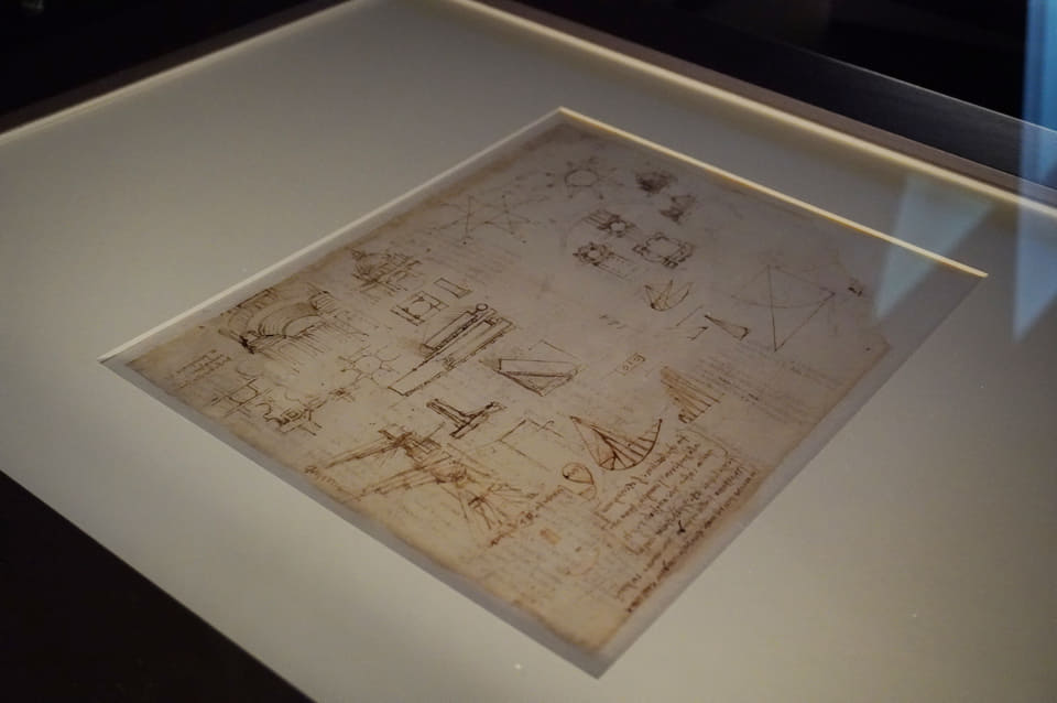 レオナルド・ダ・ヴィンチの現存する最大の素描と文書コレクション「アトランティコ手稿」。ミラノのアンブロジアーナ図書館に所蔵されてる1119枚以上の膨大な手稿のなかから4枚のページを万博全期間にわたり、入れ替えを行ないながら展示した。