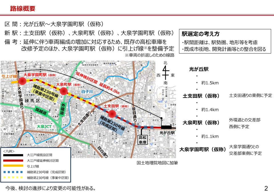 計画案では3駅のほか、延伸に伴う車両編成の増加に対応するため、既存の高松車庫を改修し、大泉学園町駅(仮称)では車両の折り返しに必要な線路(引上げ線)の整備も行なうとしている。