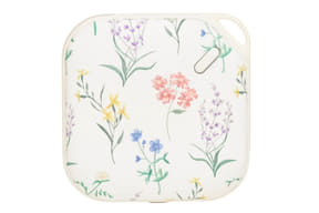 サイズは約60×60×22mm、重さ約64g。表面温度は約42℃。充電約3時間で約3~4時間稼働する。電源スイッチを押せば温かみのあるLEDライトが手元を照らす。価格は2970円で、花柄やチェック柄など全5色展開。