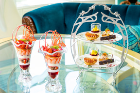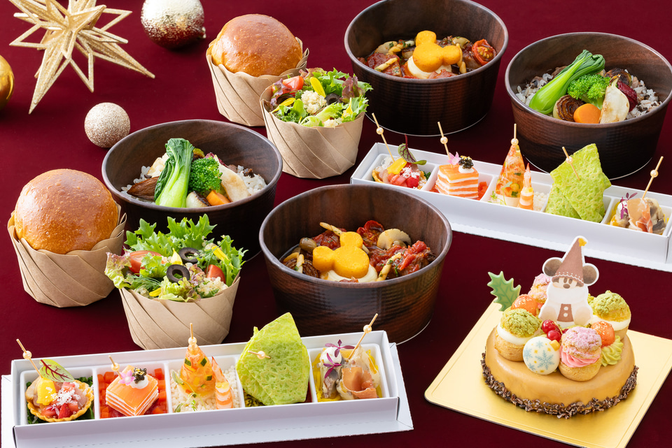 ビュッフェでは「ブッシュ・ド・ノエル」などクリスマスらしいメニューも登場。クリスマスカラーで彩られたメニューを用意する。ほかにも、ディズニーアンバサダーホテル宿泊者向けに客室で味わえる全10品テイクアウトメニューも設定。こちらは大人気のクリスマスの妖精リルリンリンがモチーフだ。
