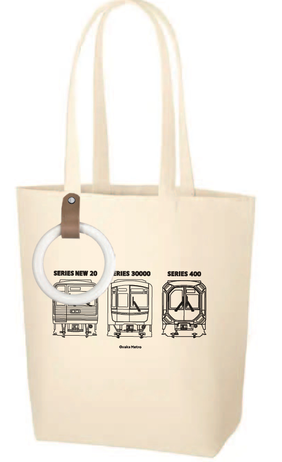 「つり革トートバッグ」は、開口部につり革を取り付けたトートバッグ。持ち手のほか、ベルトにも実使用品を用いた。バッグ本体には新20系・30000系・400系の前面をデザインしている。価格は3300円。
