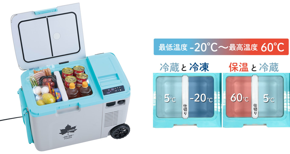 ロゴス、2室の温度を個別に設定できるポータブル保冷保温庫。容量約27L、スマホの充電も可能