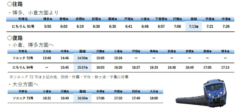 当日は、7時台~17時台(築城駅基準)の定期特急列車44本が築城駅に臨時停車。博多駅~中津駅間の臨時「にちりん」、小倉駅~大分駅間の臨時「ソニック」も各1往復設定し、これらも築城駅停車とする。