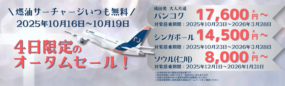 エアージャパン、4日間限定オータムセール。成田発ソウル/シンガポール/バンコクがお得に
