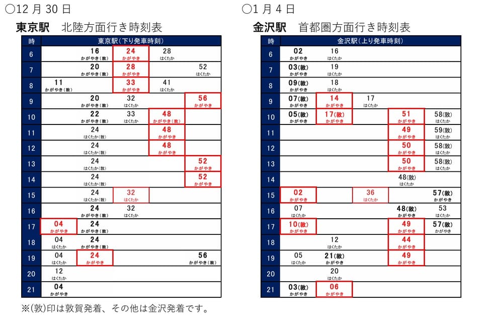 新幹線では、山陽新幹線で1日あたり最大88本、北陸新幹線で最大25本の臨時列車を運転。北陸新幹線の「つるぎ」には、接続する特急「サンダーバード」も設定する。