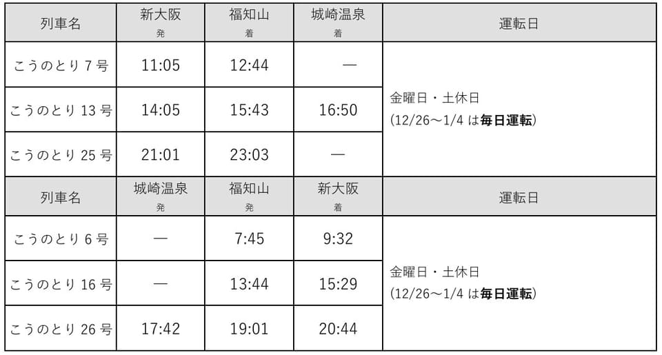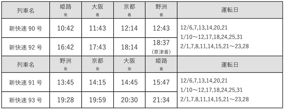 このほか、香住駅発着で運行している「はまかぜ」の定期列車1往復を、特定日に浜坂駅発着に延長。新快速列車の指定席「Aシート」は、特定日の日中と夕方~夜間に設定列車を2往復増やす。