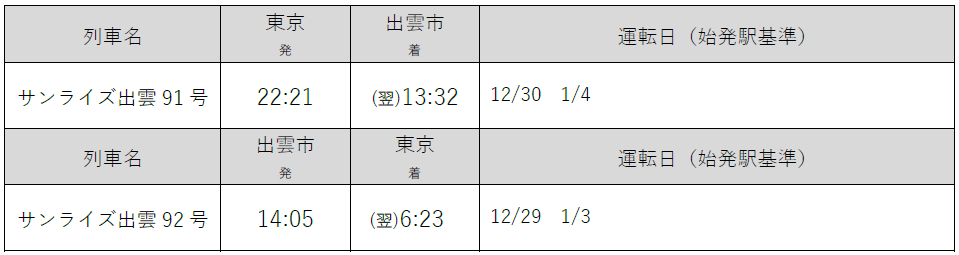 下り列車(東京駅発)は定期列車より遅く、上り列車(出雲市駅発)は早く運転する臨時寝台特急「サンライズ出雲91号・92号」は、年末年始に計2往復を設定。12月29日・1月3日に上り、12月30日・1月4日に下りを運転する(始発駅基準)。