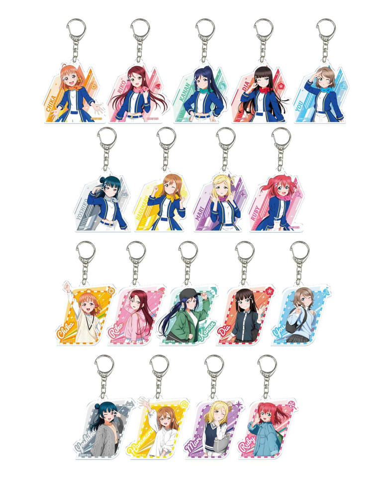 私服ビジュアルを使用したアクリルスタンド(全9種、各2200円)のほか、各キャラクターの私服とコラボ楽曲衣装からなるトレーディングアクリルキーホルダー(全18種・ランダム、1個800円)を展開。
