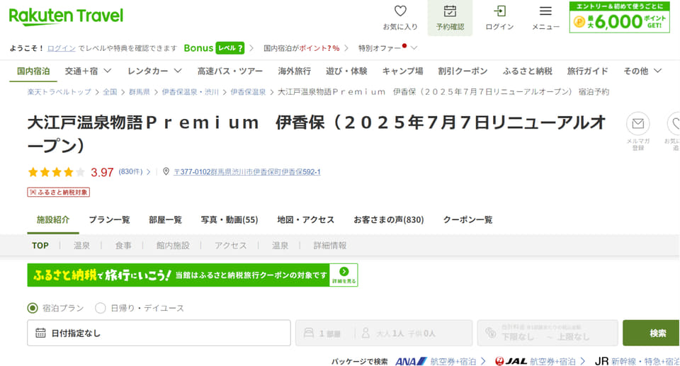 大江戸温泉物語Premium 伊香保、1泊2食バイキングが最大15%オフ。名湯と郷土グルメを堪能