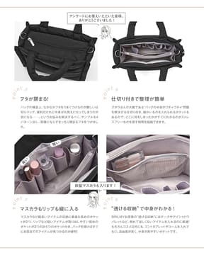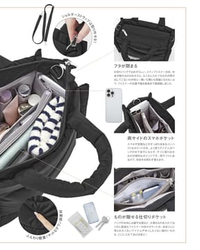 コスメオタク編集者が本気で作ったビューティブランド「ブリルミー」の新作で、機能的な仕切りと多ポケットが特徴。リップやマスカラなどのメイク道具もそのまま収納できる縦長ポケット、入れた中身が分かりやすいメッシュポケット、両サイドのスマホポケット、倒れる心配がない600mLペットボトルホルダー、失くしたくない鍵やパスポートをしまえるジップポケットが備わる。