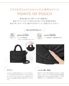 ふんわり軽い波型キルティング生地に、マットなダウン調のブラックカラーを合わせたデザイン。サイズは約25×9.5×20cm(幅×奥行き×高さ)。取り外し可能なショルダーストラップ付きなので、手持ちでも肩掛けでも使える。