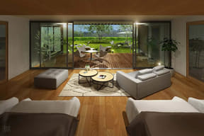 夕食BBQは、富士山黒牛や甲州牛など山梨県産食材を楽しめるものに。冬期はすき焼きコースを提供する。また、インクルーシブサービスとしてドリンク飲み放題のバーを設ける。
