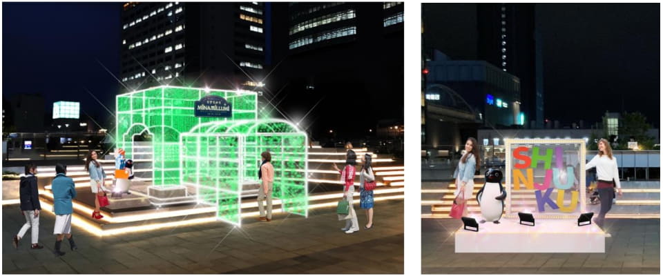 新宿ミナミルミの入り口となる新南改札外のSuicaのペンギン広場では「WELCOME to SHINJUKU ミナミルミ!」をテーマに、ウェルカムゲートを設置する。JR南新宿ビルにはゴールドとレッドが基調の「Authentic Christmas」、JR新宿ミライナタワーには冬の夜空に広がる星々と雪景色をイメージした「Winter Elegance」がテーマのクリスマスツリーが登場する。