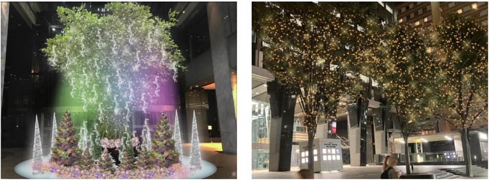 新宿サザンテラス・小田急サザンタワーは「Gold Installation」として、樹木のイルミネーションとシャンパングラスのオブジェを設置する。