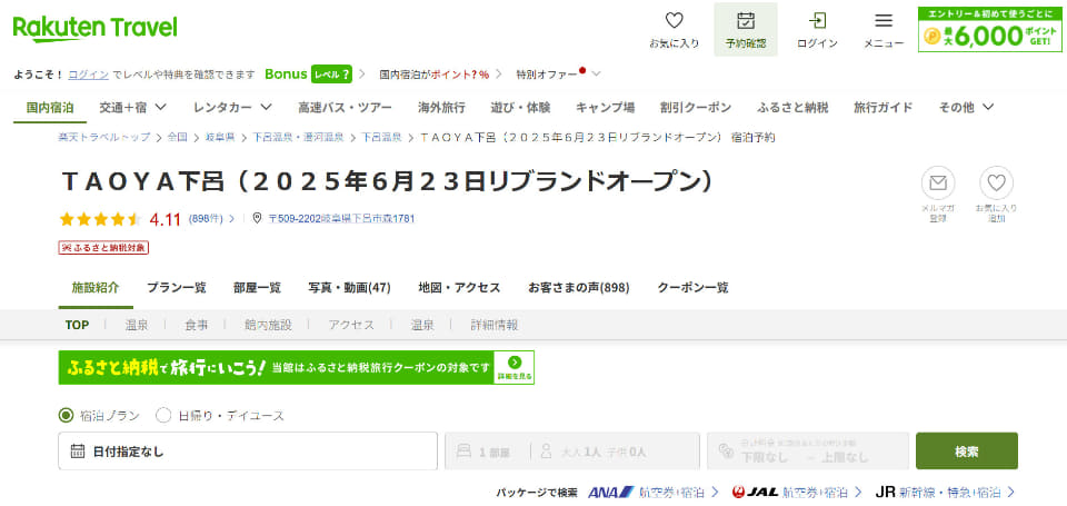 TAOYA下呂、1泊2食プラン最大15%オフ。南飛騨の眺望とグルメ楽しむ温泉リゾート