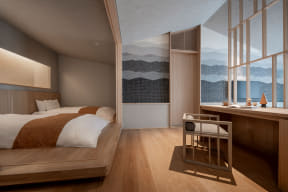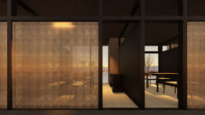 ブランドとしては群馬県で初めて、星野リゾートとしては2軒目となり、草津白根山を望む高台に立地。宿泊棟のほか、大浴場の湯小屋棟、ラウンジ棟など複数の棟に分かれた構成になる。客室は露天風呂付き含む全94室で、そのほか上州の食文化を会席料理で味わう食事処、ショップ、中庭などが付帯。
