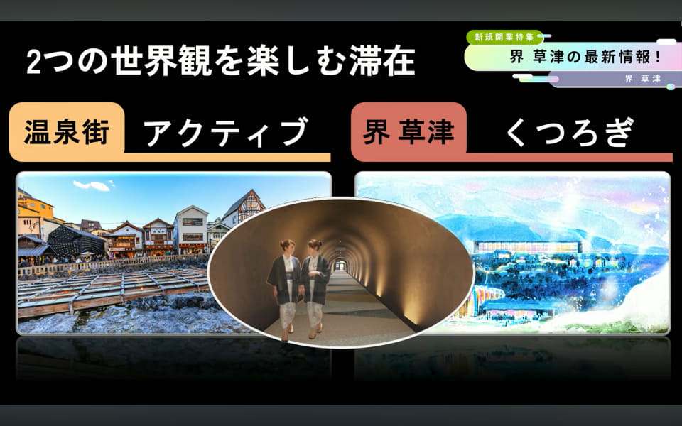 また、草津温泉街に直結する宿泊者専用トンネルを開設。トンネルを抜けると、大露天風呂で知られる“西の河原公園”のすぐ横に出ることができ、湯畑周辺の散策が楽しめるという。