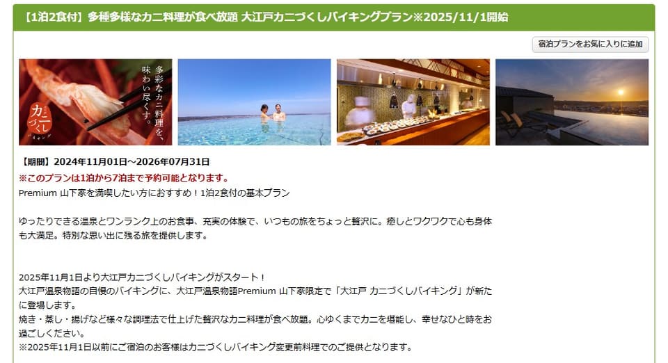 大江戸温泉物語Premium 山下家、カニ料理食べ放題が最大15%オフ。温泉郷を一望「加賀天空の湯」