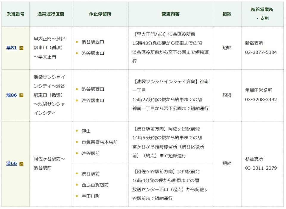 同じく渋谷駅東西で循環運転し、池袋駅東口・池袋サンシャインシティとの間を結ぶ池86系統でも区間短縮を実施。こちらは神南一丁目から渋谷駅西口・渋谷駅東口を経由せず宮下公園に向かうルートとなる。