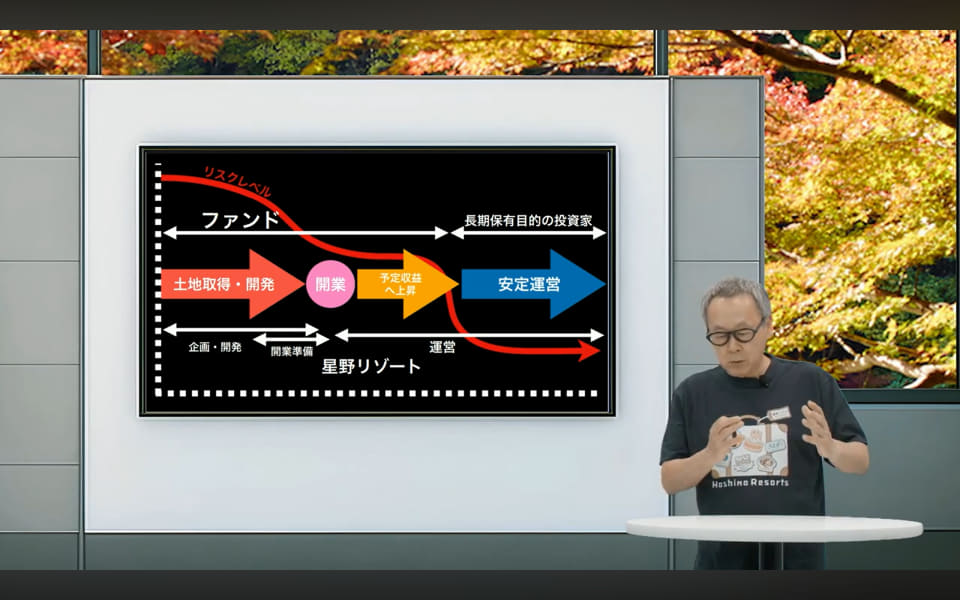 前回のバブルのとき星野リゾートはまだ軽井沢に1軒だったが、今は73軒あり、たくさんの開業案件を抱えている。「『お前が一番バブルじゃないか』と私自身も感じることはある」が、それでも開業を続けている理由は「所有と開発を離れ、“運営”に特化する戦略で成長してきた」から。開発から運営までを一貫して行なうのではなく、リスクの高い土地取得や開発段階はファンドに委ね、開業後の運営に専念することで安定的な成長を実現してきた。