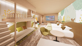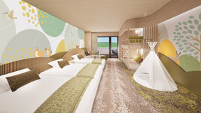 森のアウトドアをテーマにした「キッズテラスルーム」は4室で、63m2の客室は芝生エリアと直結。最大定員は6名で、三世代旅行にも利用できる。