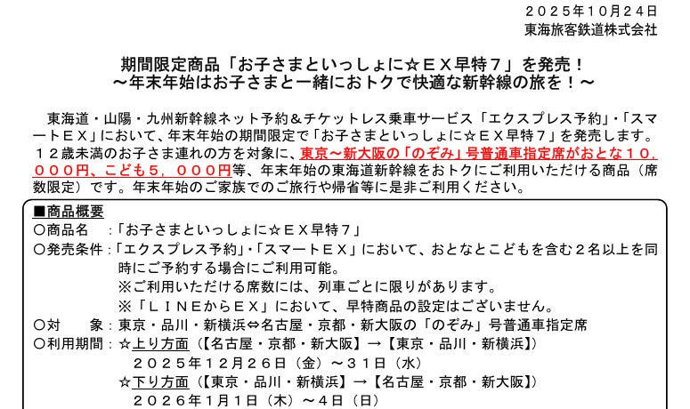 JR東海は、企画商品「お子さまといっしょに☆EX早特7」を設定する。12月5日10時から乗車日7日前まで購入可能で、利用期間は上り(東京方面)が12月26日~31日、下り(新大阪方面)が2026年1月1日~4日。