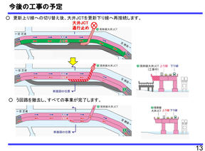 今回の下り線の切り替え後は、上り線の切り替え、大井JCT連絡路の切り替え、う回路の撤去と進み、工事完了は2030年度の予定となっている。事業費は当初912億円とされていたが、鋼材を中心とした部材や労務費の高騰などにより1627億円を見込んでいる。