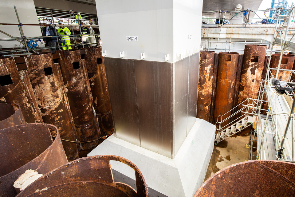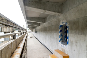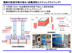 そこで今回の更新では海水面から約12~20mと大幅に引き上げることで塩分の影響を受けにくくするとともに、道路下部に恒久足場を設けることにより点検のしやすさと飛来塩分を遮断する構造を採用。橋脚部は海水面に近いところをステンレスライニングとすることなどにより腐食を防ぐ構造にしていると述べた。