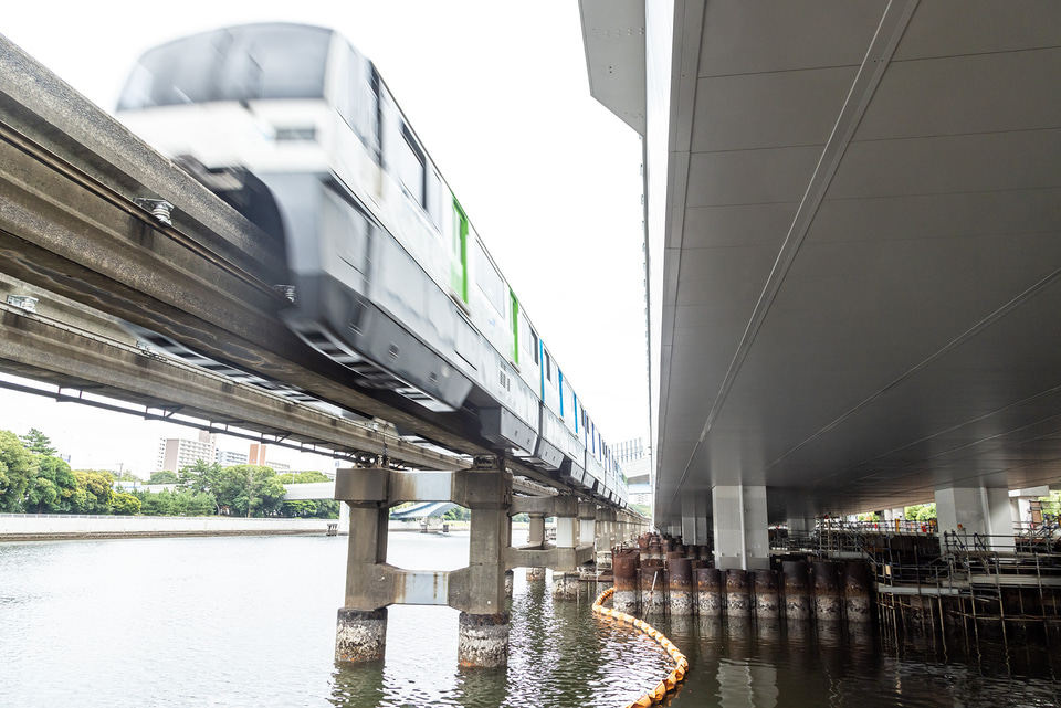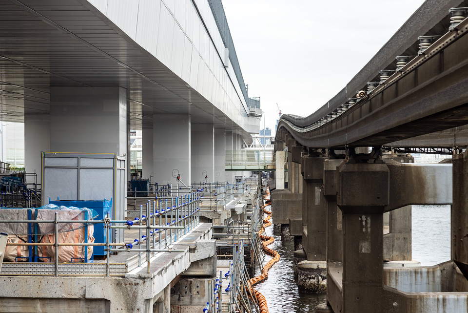 そこで、海水面からの離隔を確保するとともに橋脚の防食対策を強化したうえで、維持管理の利便性を高める「恒久足場」の導入などを核としたリニューアル工事をスタート。ただし、この区間は東京モノレールと陸地に挟まれた狭隘なエリアであるとともに長期間の通行止めが難しいことから、う回路を設置して片方向ずつ撤去、新設を行なう工程を採用。