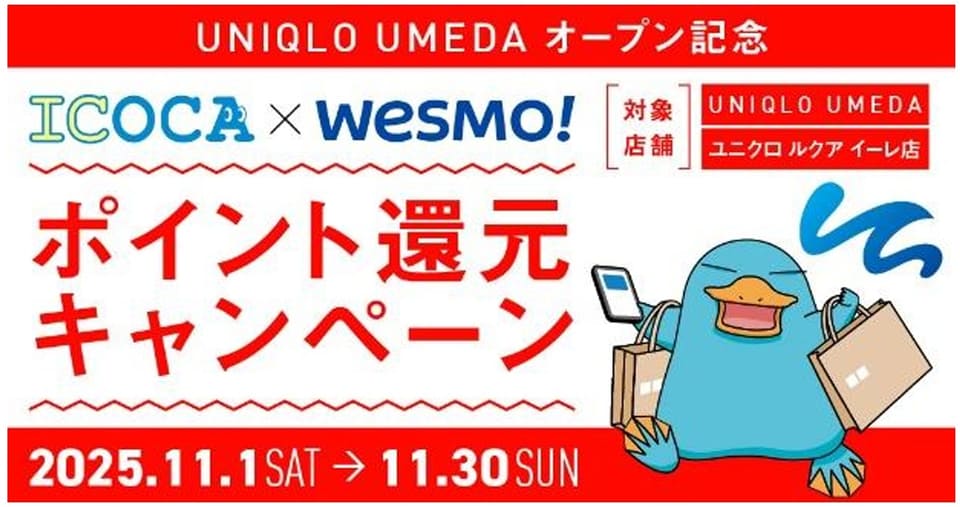 なお11月1日~11月30日に、先述した2店舗で利用金額200円につきWESTERポイント10ポイントを還元するキャンペーンを行なう。対象の決済手段はモバイルのICOCAまたはWesmo!で、ウォレットアプリを利用した場合やポイントで支払った場合は対象外となる。