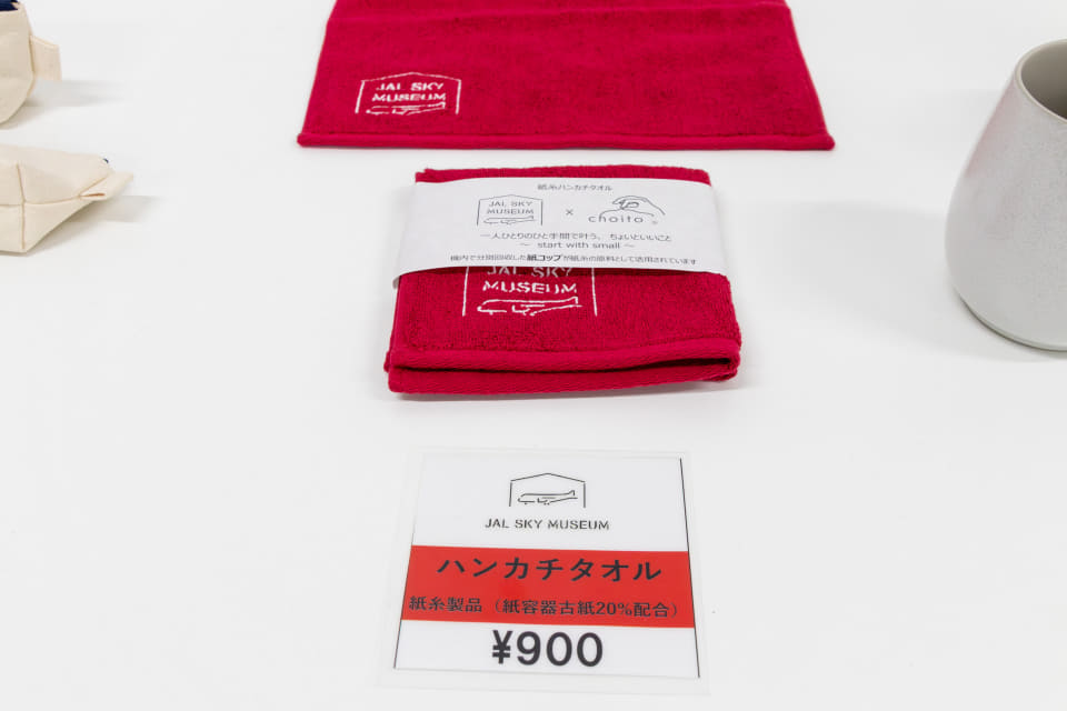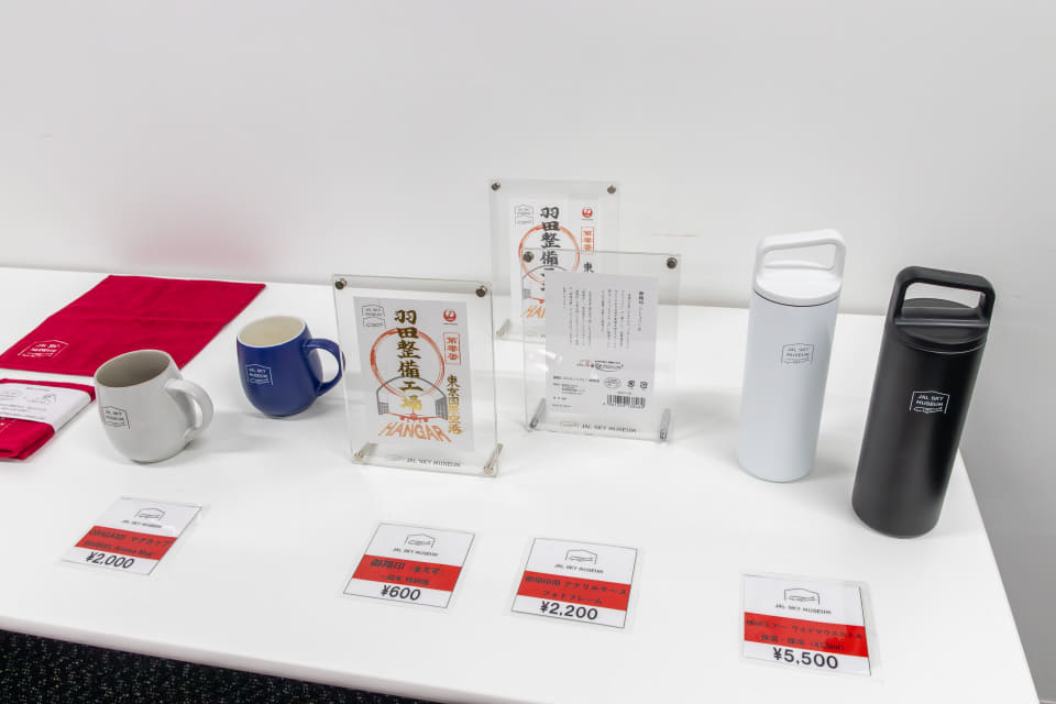 ここでしか買えない「JAL SKY MUSEUM限定商品」のラインアップも拡充された。数量限定の「御翔印(発売開始1周年記念版)」(600円)、機内で回収した紙コップを原料とした「タオルハンカチ」(900円)の新色・赤を用意するほか、マグカップ、ステンレスボトル、ポーチやペンケースなどを販売する。