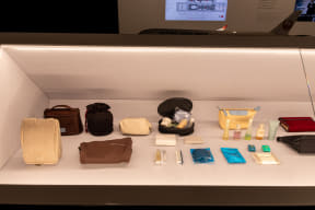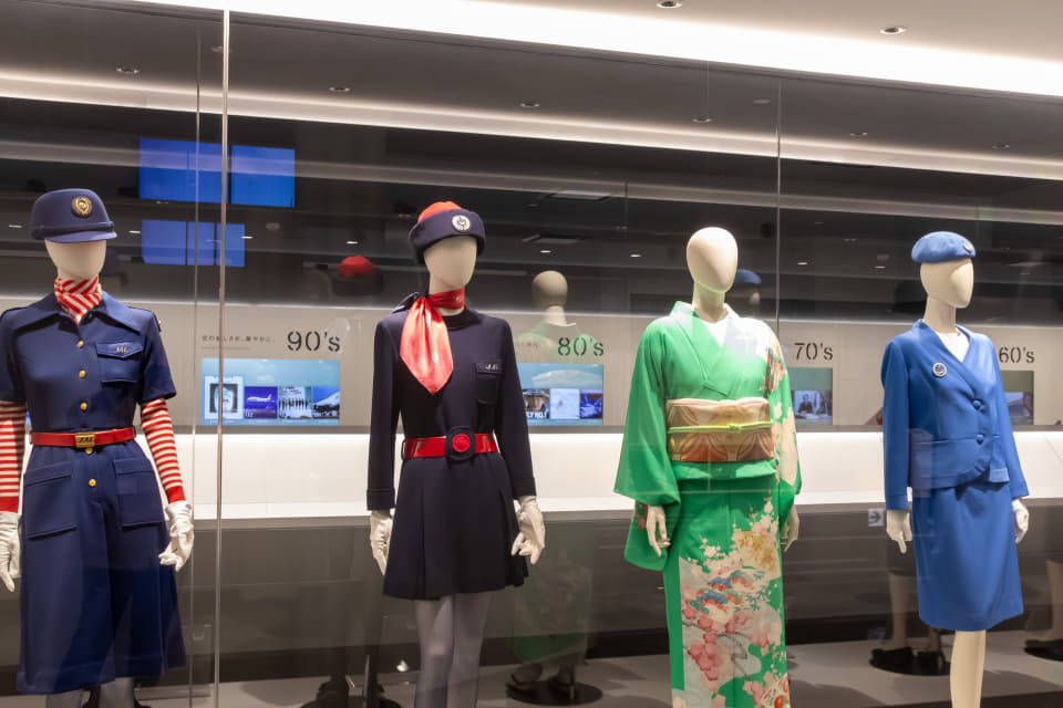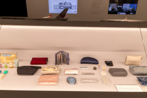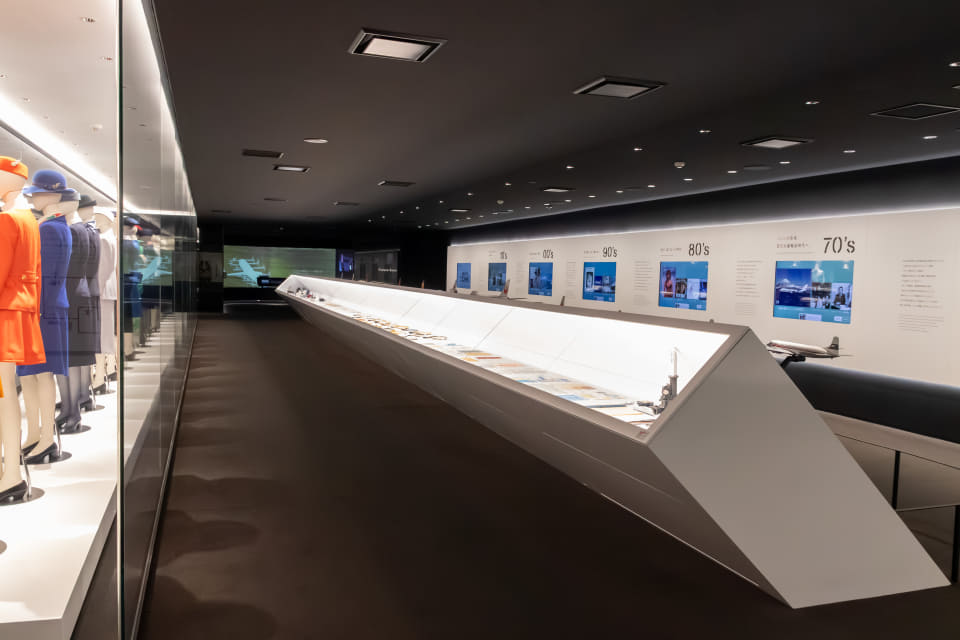 JALの歴史や航空業界の発展を学べるアーカイブゾーンの展示物も更新。現物史料の展示を“年代別”から“アイテムごと”に変更して入れ替えてある。今回から展示されるのは、機内で配布していたアメニティキット、シティガイド、機内配布の扇子、1950年代のパンフレットなどだ。