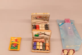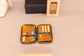 歴史を感じるパンフレットはとても興味が引かれるし、扇子を配布していたというのも驚きだ。さらにファーストクラスやビジネスクラスで配布していたアメニティには、現在では保安上の理由から考えられない、ハサミを同梱したソーイングセット、ネイルキットなども展示されている。