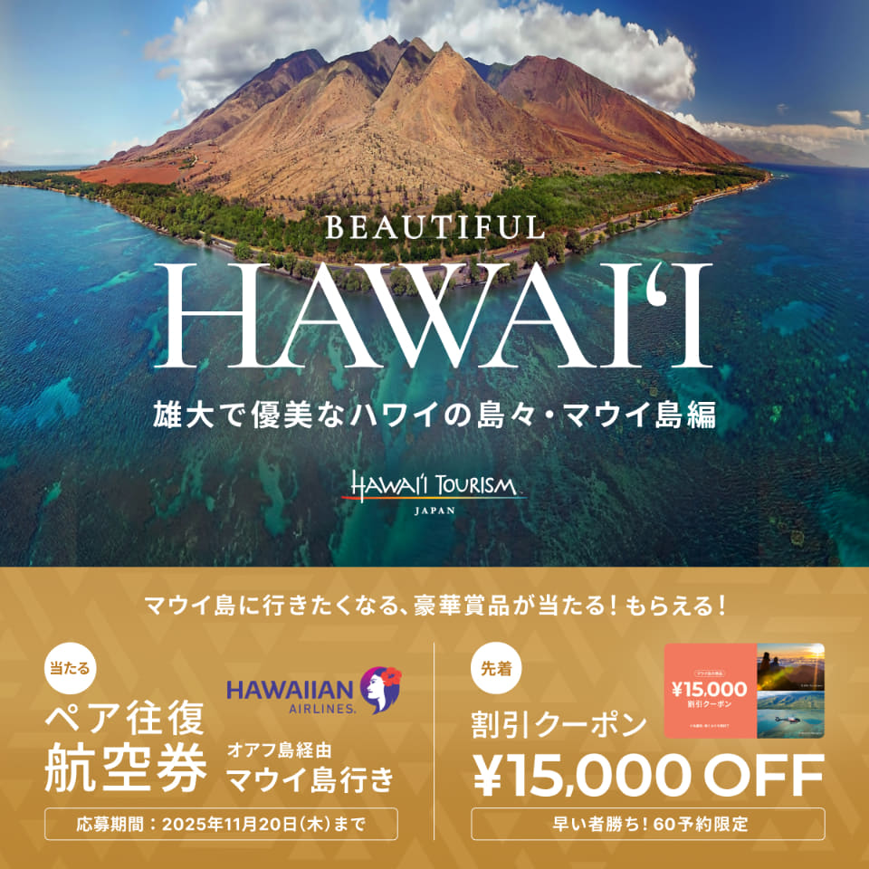 さらに、現地体験型アクティビティ専門予約サイト「ベルトラ」のマウイ島でのアクティビティ・ツアーに使える1万5000円オフクーポンを先着60枚限定で配布する。対象の参加期間は10月22日~2026年12月31日。