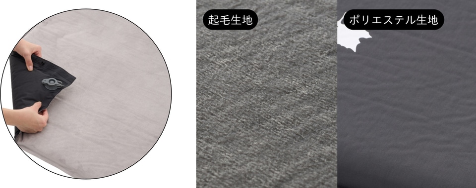 表面は肌ざわりのよいグレーの起毛生地、裏面はさらっと快適なブラックのポリエステル生地を採用しており、オールシーズン対応。また、起毛生地を肌面にすると、寝返りを打った際の衣擦れの音も軽減する。
