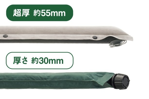 55mmの厚手のマットはクッション性があり、地面の凹凸を感じにくく快適な寝心地を提供する。さらに、マットの両サイドには連結可能なボタン付いており、シーンにあわせて拡張することができる。持ち運びや保管に便利な収納バッグ付き。