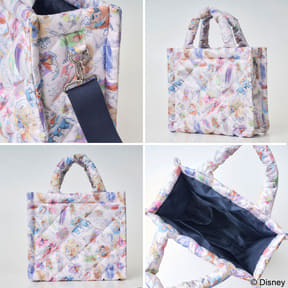 ディズニーの歴史を感じる壮大なアートを“インク・アンド・ペイント(アニメーション制作の着色過程)”のように表現したキルティングバッグ。白雪姫やピノキオ、魔法使いの弟子、アリスに白うさぎ、ティンカー・ベル、フック船長、オーロラ姫など、総勢31キャラクターが登場する総柄で仕上げている。