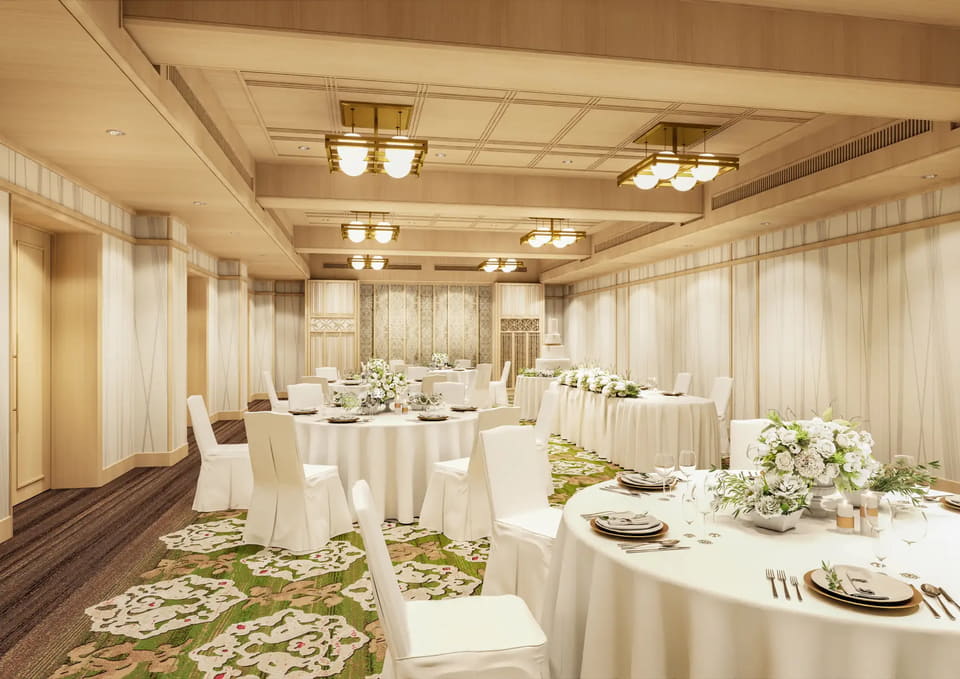 日本料理店の「花菊」は鉄板焼店に改め、日本料理とフランス料理の伝統的技法を組み合わせた食事を提供。宴会場「若草の間」には正倉院文様の絨毯を採用し、白色が基調でブライダルにも使える会場に改装する。