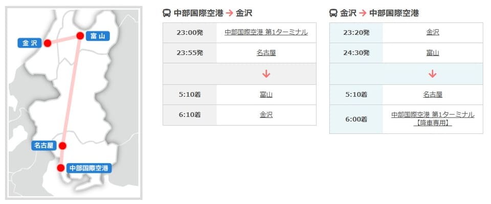 金沢駅西口から中部国際空港(セントレア)第1ターミナル間を、富山駅北口・名古屋(名古屋駅太閤通口南側)経由で運行。1日1往復の設定で、往路・復路いずれも起点を23時台発、終点に6時台着の時刻となっている。