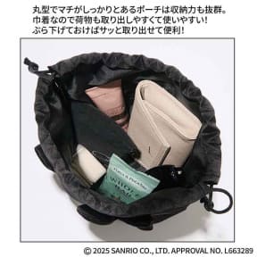 増刊号の特別付録は、ハローキティの顔をモチーフにした真っ黒な巾着ポーチ。光沢のあるサテン調の生地がポイントで、かわいらしいデザインながらシックな印象に仕上がり、大人でも取り入れやすいアイテムとなっている。サイズは25×14×25cm(幅×奥行き×高さ)。