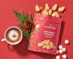 季節限定フレーバーとして、ペパーミント・マカデミア、ダーク・チョコレート・ペパーミント・マカデミア、ホワイト・チョコレート・ジンジャー・スパイス、シナモン・シュガーが復活。昨シーズンも人気だった、ペパーミント・マカデミアの1口サイズ詰め合わせパック(ミニバイツ・スナックパック、約198g)も登場する。