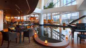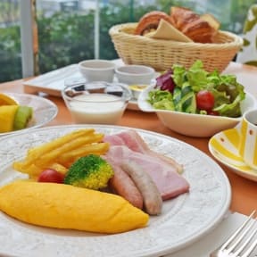 朝食は、ホテル2階のオールデイダイニング「カフェトスカ」でビュッフェを提供。シェフが作るふわとろオムレツやフレッシュジュース、さらに天然酵母を使ってホテル内の工房で焼き上げるメゾンカイザーのパンが人気。ほかにも自分でカスタマイズできるパンケーキや和食を用意している。