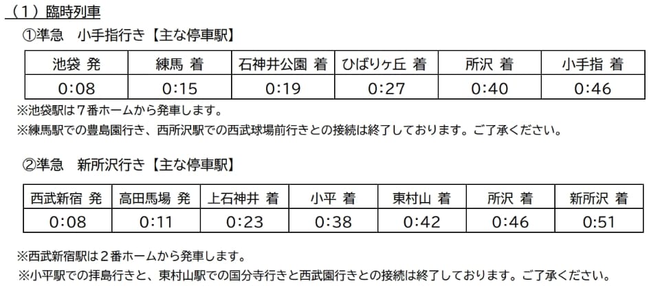 臨時の普通列車は、池袋線の準急「小手指行き」(池袋駅0時08分発、小手指駅0時46分着)、新宿線の準急「新所沢行き」(西武新宿駅0時08分発、新所沢駅0時51分着)の2本。