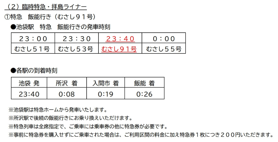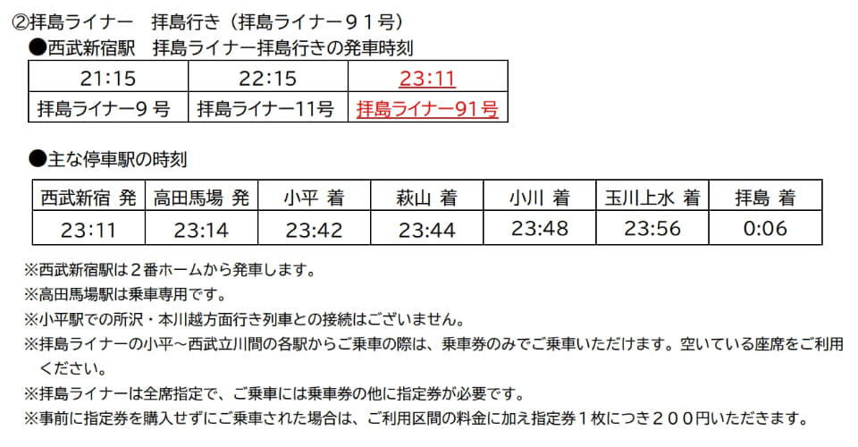 臨時の特急・拝島ライナーは、飯能行きの池袋線特急「むさし91号」(池袋駅23時40分発、飯能駅0時26分着)、新宿線「拝島ライナー91号」(西武新宿駅23時11分発、拝島駅0時06分着)の2本を運行する。
