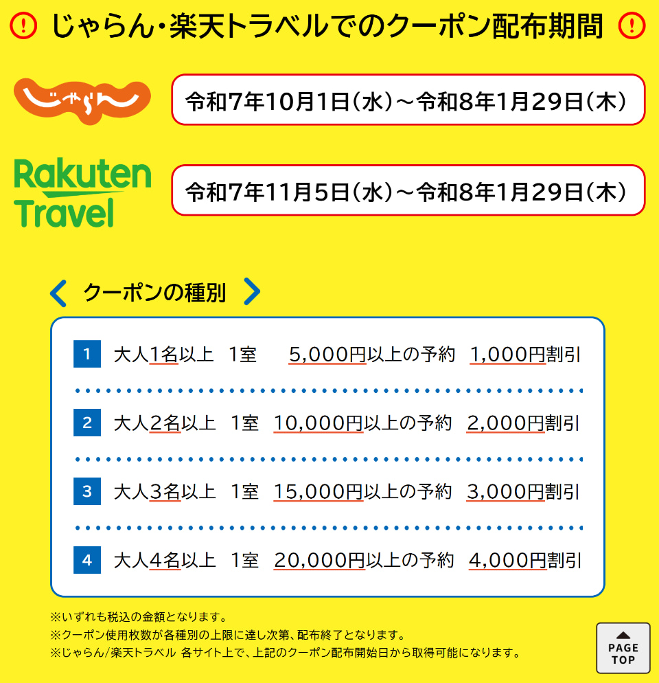 対象の観光施設・宿泊施設で平日にお得な特典を提供するもの。じゃらんでは10月1日から、楽天トラベルでは11月5日から最大4000円引きの宿泊クーポンを数量限定で配布している。