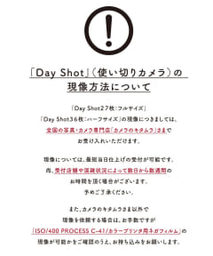 使い切りフィルムカメラ「DAY SHOT」は、スマホやデジカメとは異なり、フィルムを現像・プリントして写真を確認するタイプ。でき上がりを見るまでのドキドキ感や失敗も含めて醍醐味であり、フィルムカメラ特有のエモい写真がフィルターなしで撮影できるという。