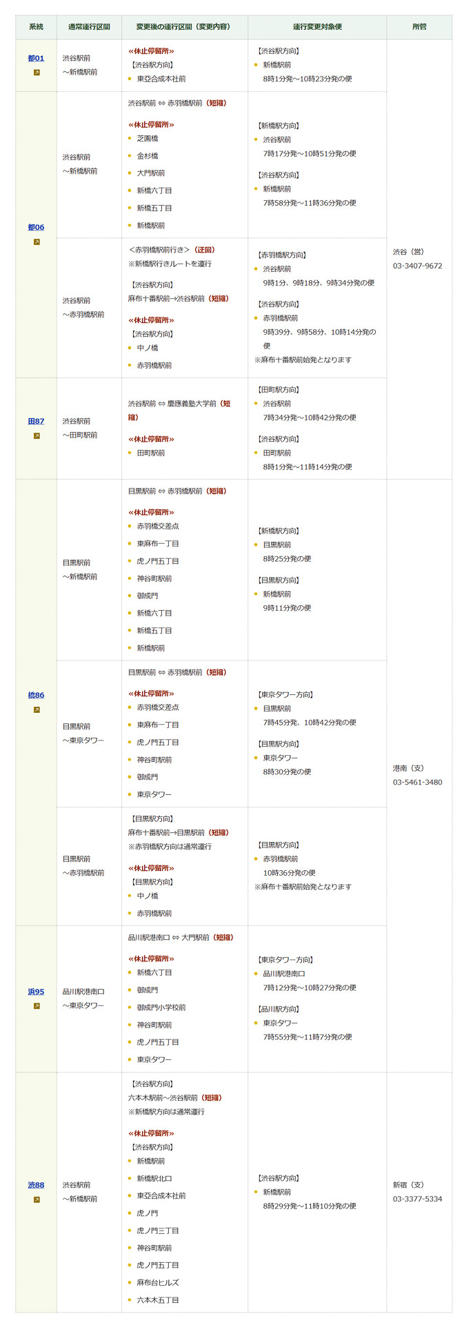 目黒駅前~新橋駅前・東京タワー・赤羽橋駅前間で運行している橋86系統では、新橋駅前・東京タワー発着便をいずれも赤羽橋駅前行きに短縮。赤羽橋駅前発着便は、目黒駅前行きのみ麻布十番駅前始発に短縮する。