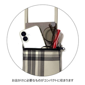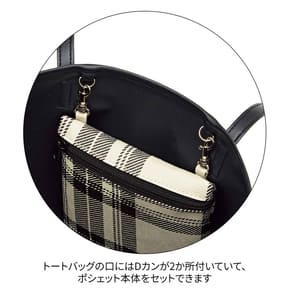 ポシェットは、モノトーンの大判チェック柄が特徴。サイズは約17.5×14cmで、お出かけに必要なものをコンパクトにしまえる。単体で使うのはもちろん、ショルダーストラップを取り外してトートバッグのDカンにセットし、吊りポケットとして使うこともできる。